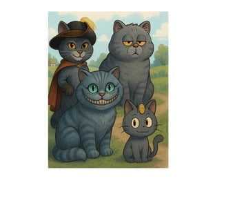 Outro ícone inegável é o Cheshire Cat (Gato Risonho) de Alice no País das Maravilhas. Nas versões mais modernas — principalmente a da Disney em live-action — o personagem tem pelagem azul acinzentada, olhos grandes e redondos e uma postura calma, quase sobrenatural, que remete diretamente ao visual do British Shorthair. O gato de sorriso enigmático representa bem o ar misterioso e calmo que muitos tutores reconhecem em seus British.